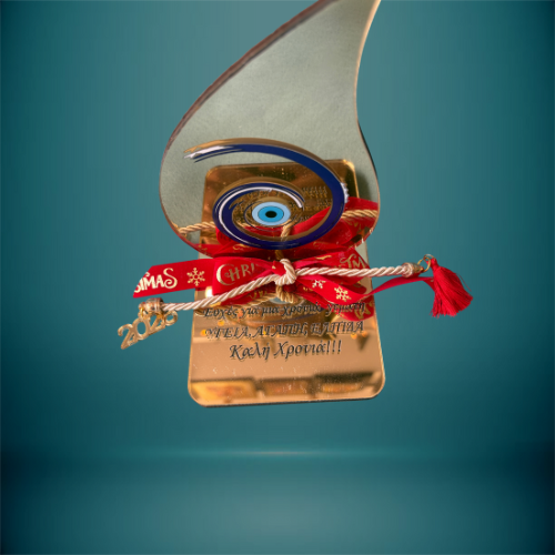 Ένα κομψό και μοντέρνο γούρι για καλοτυχία και προστασία τη νέα χρονιά. Κατασκευασμένο από χρυσό plexiglass καθρέφτη σε σχήμα σταγόνας, φέρει στο κέντρο καλλιτεχνικό σχέδιο με το “μάτι”. Στη βάση είναι χαραγμένη η ευχή “Υγεία, Αγάπη, Ευτυχία” και είναι στολισμένο με κόκκινη κορδέλα και μεταλλικό στοιχείο “2025”, αποτελώντας μια λαμπερή επιλογή για δώρο ή διακόσμηση.