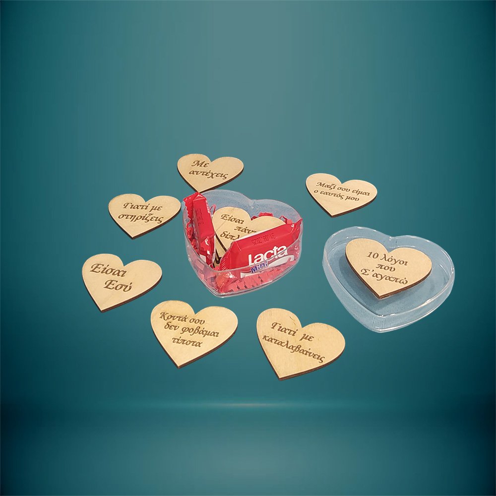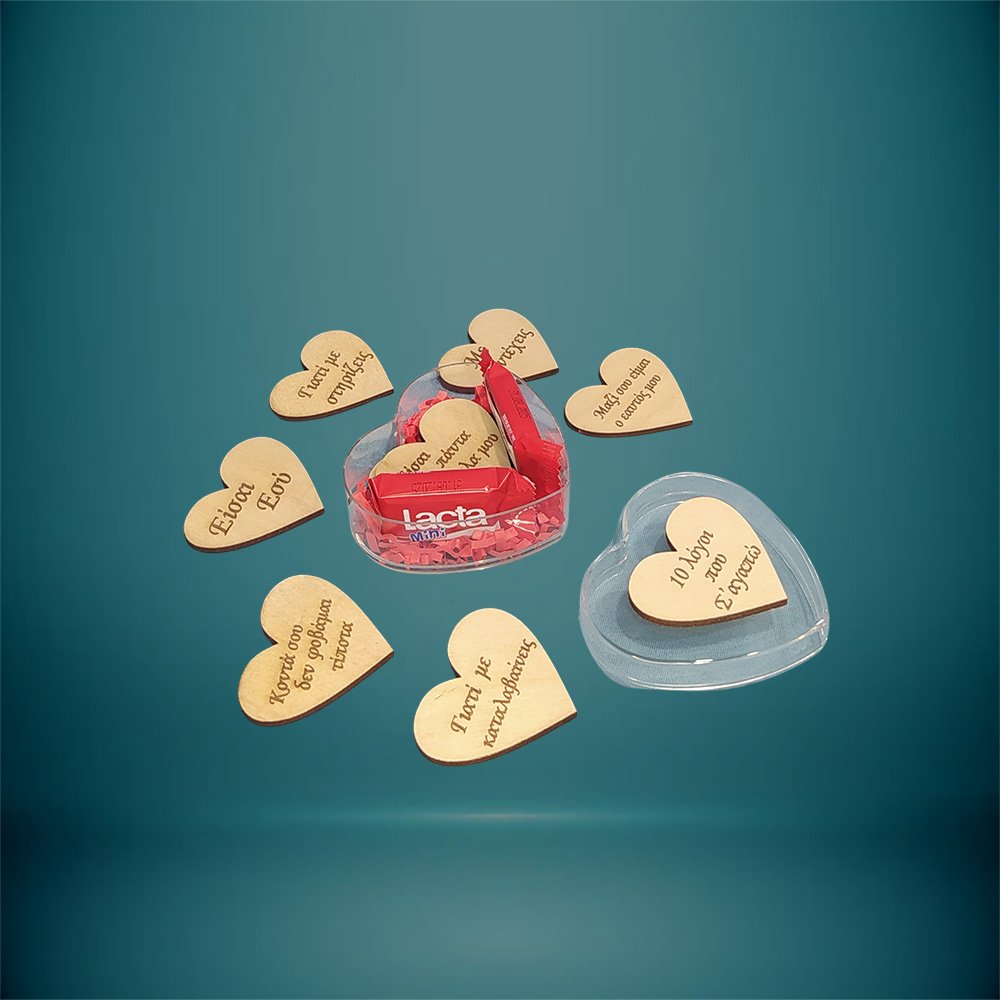 Ένα ρομαντικό σετ από ξύλινες καρδούλες με χαραγμένες φράσεις αγάπης, μέσα σε κουτάκι σε σχήμα καρδιάς. Ιδανικό δώρο για του Αγίου Βαλεντίνου, επέτειο ή απλά για να πεις «σ’ αγαπώ» με τρόπο που μένει.
